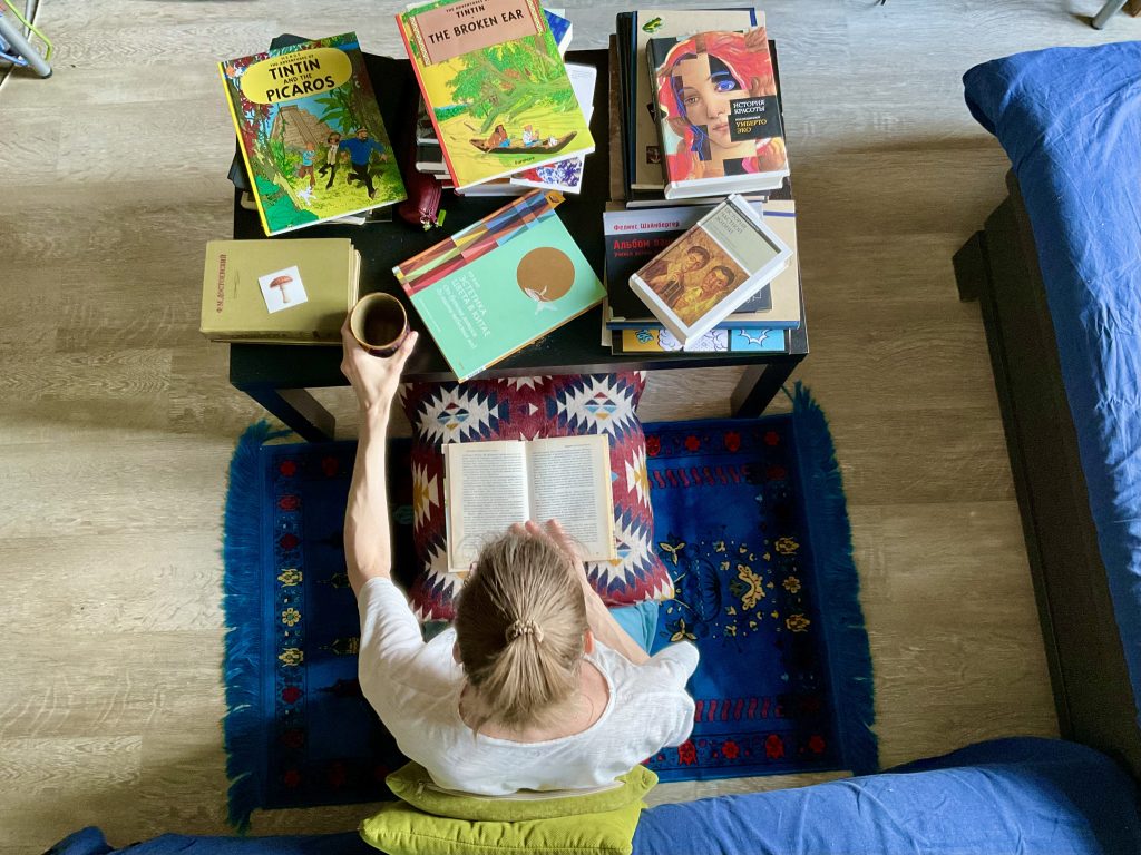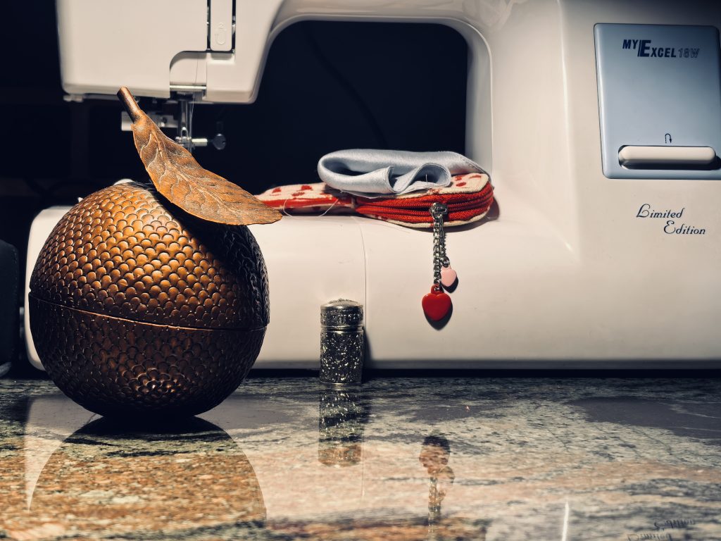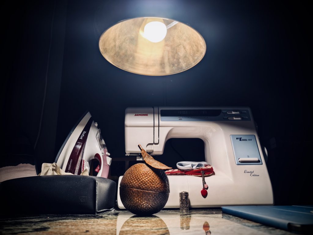 Нашли в коробке, которая служит сундуком, завалявшийся отрез шёлка. Решили его подшить, чтобы сделать красивый шёлковый шарф. Так как шёлк — материал капризный, за один день не справились, отложили до следующего дня. Во время вечернего чаепития открылась вот такая картина: